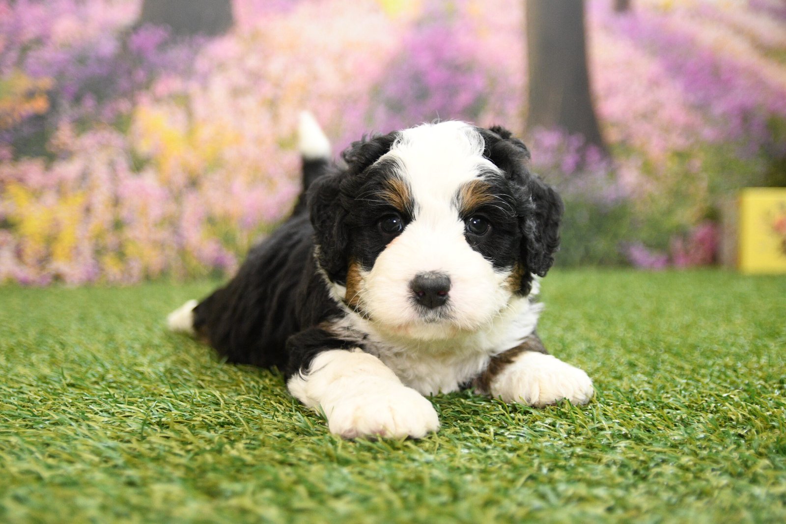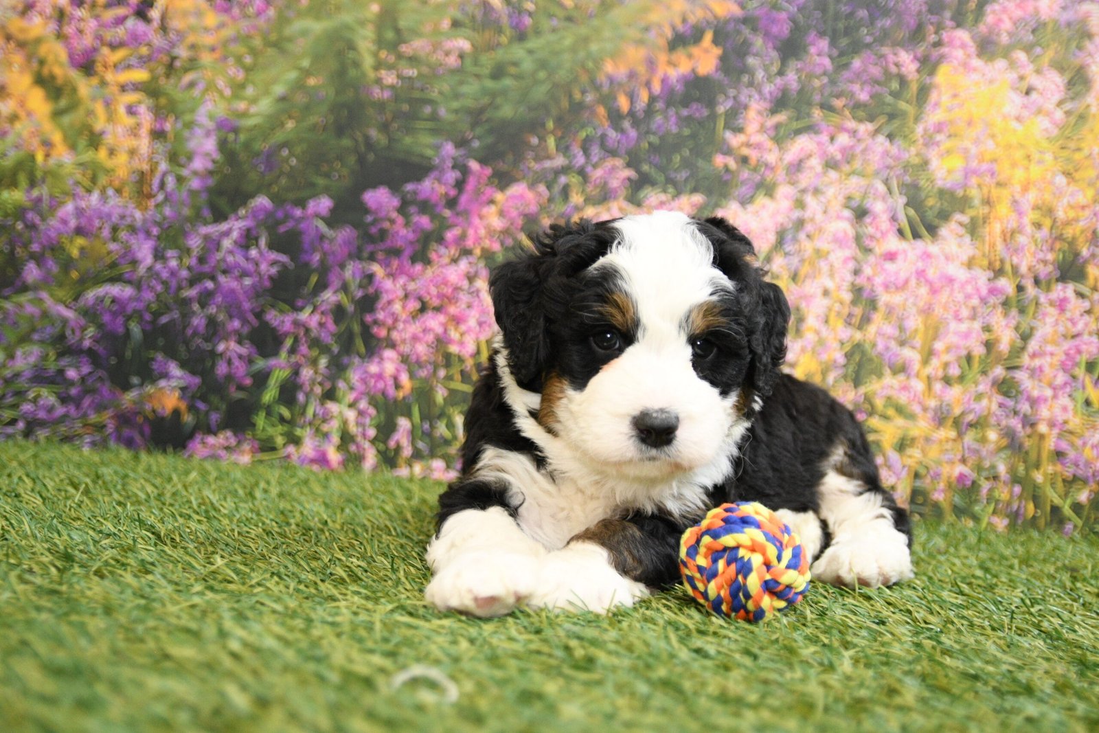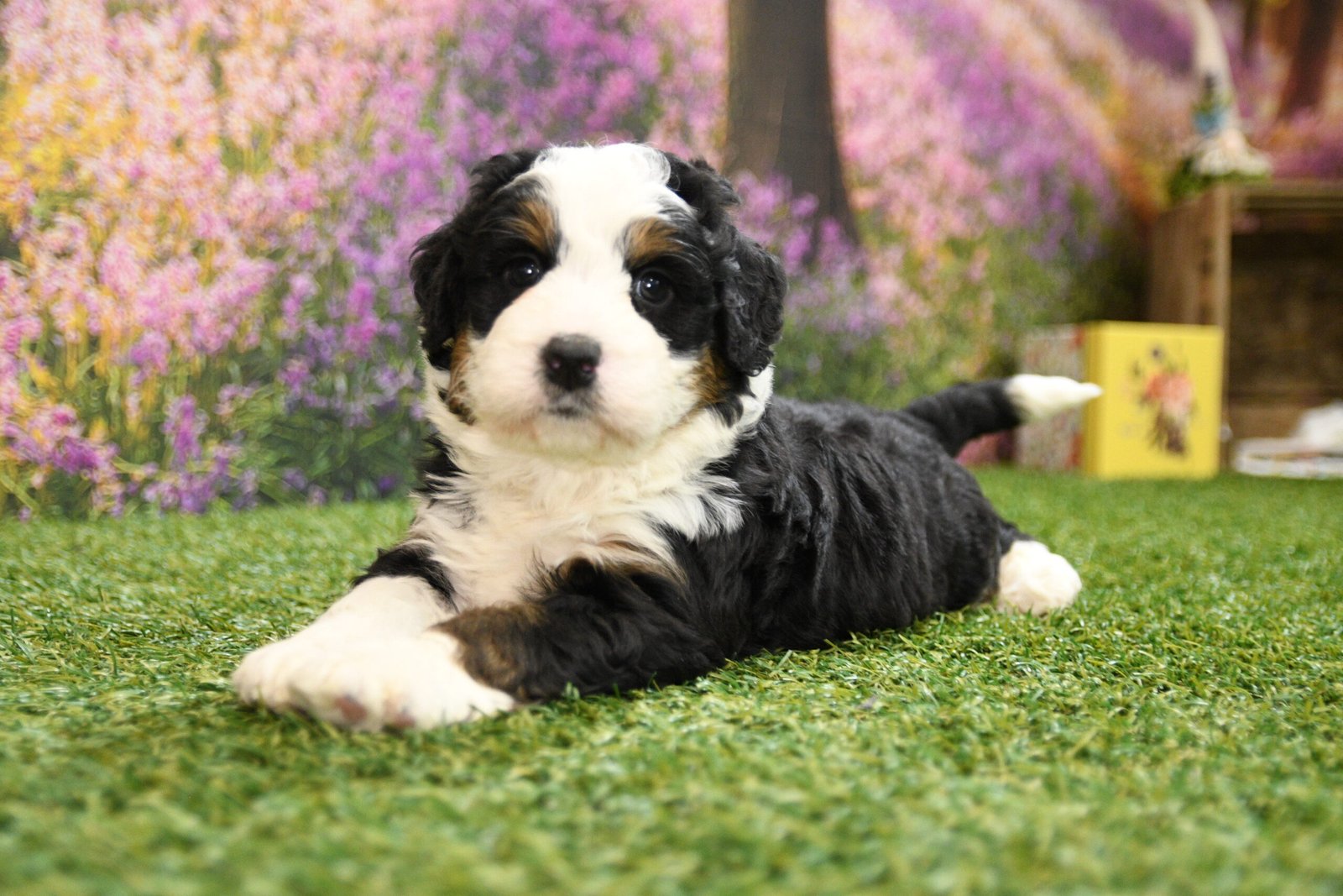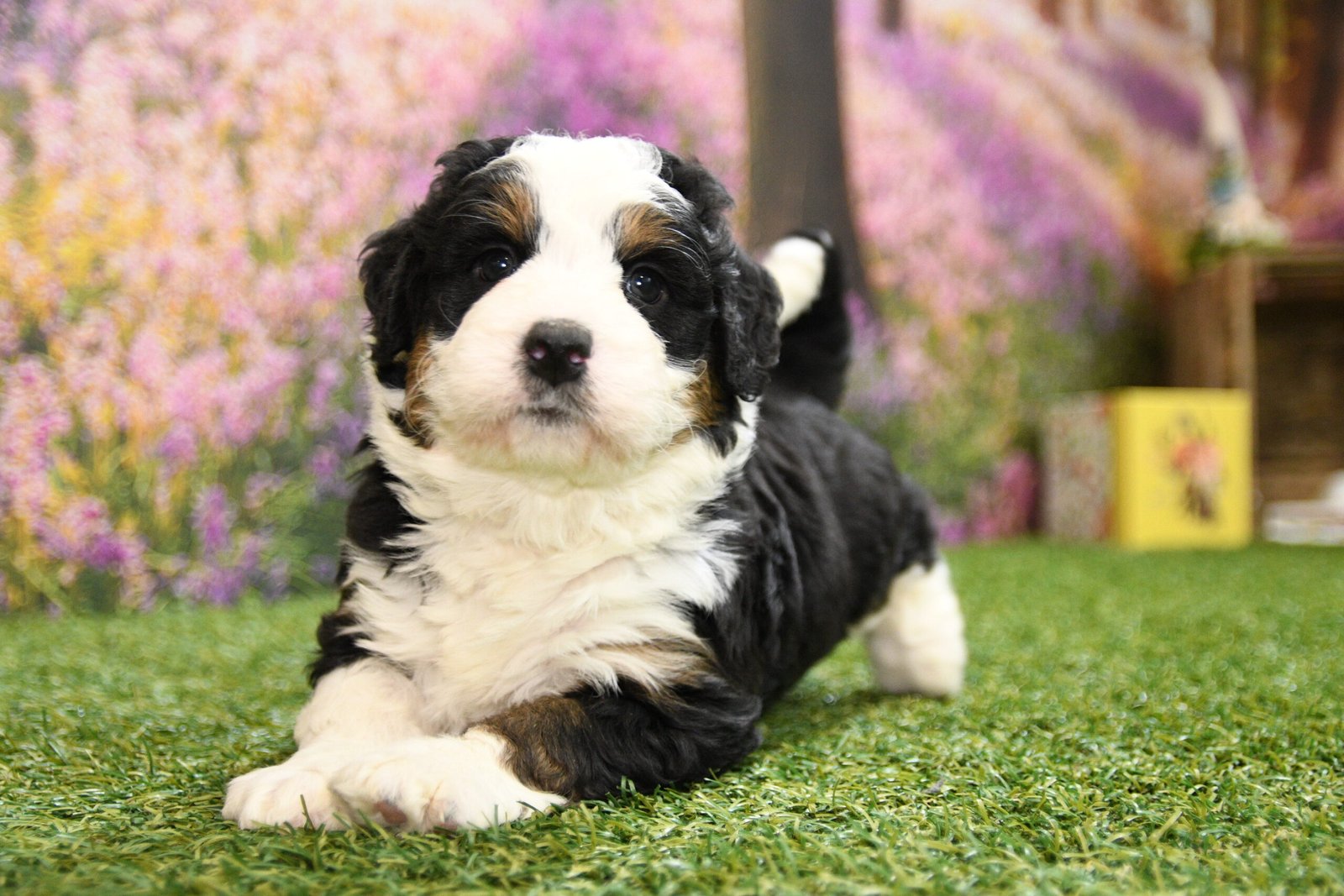Beau is an F1 mini Bernedoodle that I estimate to be between 35 to 45 pounds as an adult. Our proud parents are Tootsie and Jethro. The mom, Tootsie, is an AKC registered Bernese Mountain Dog that weighs 95 pounds. The dad, Jethro, is a mini-Poodle that weighs 15 pounds. He is fully furnished, so your puppy is guaranteed to have a fluffy face, known as the teddy bear look.