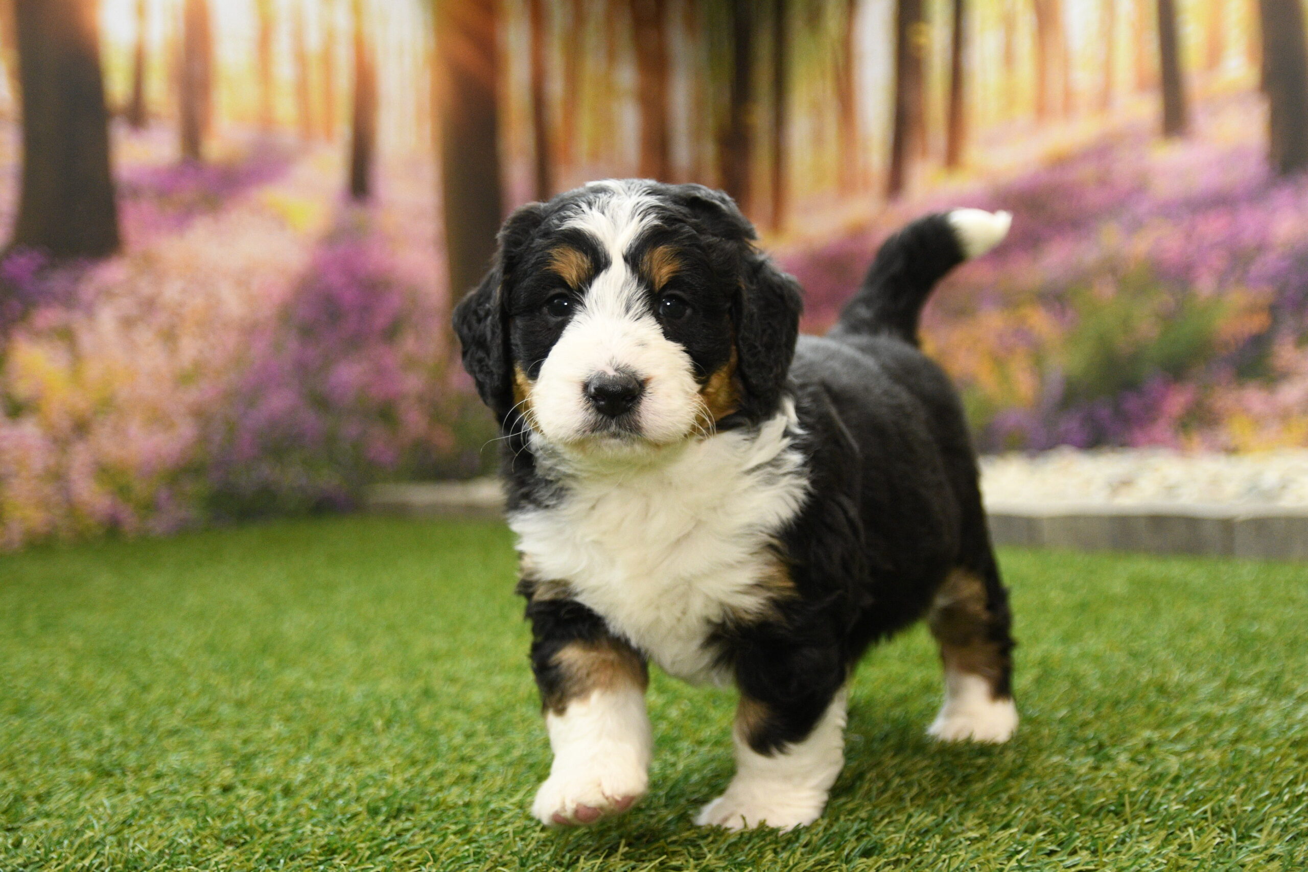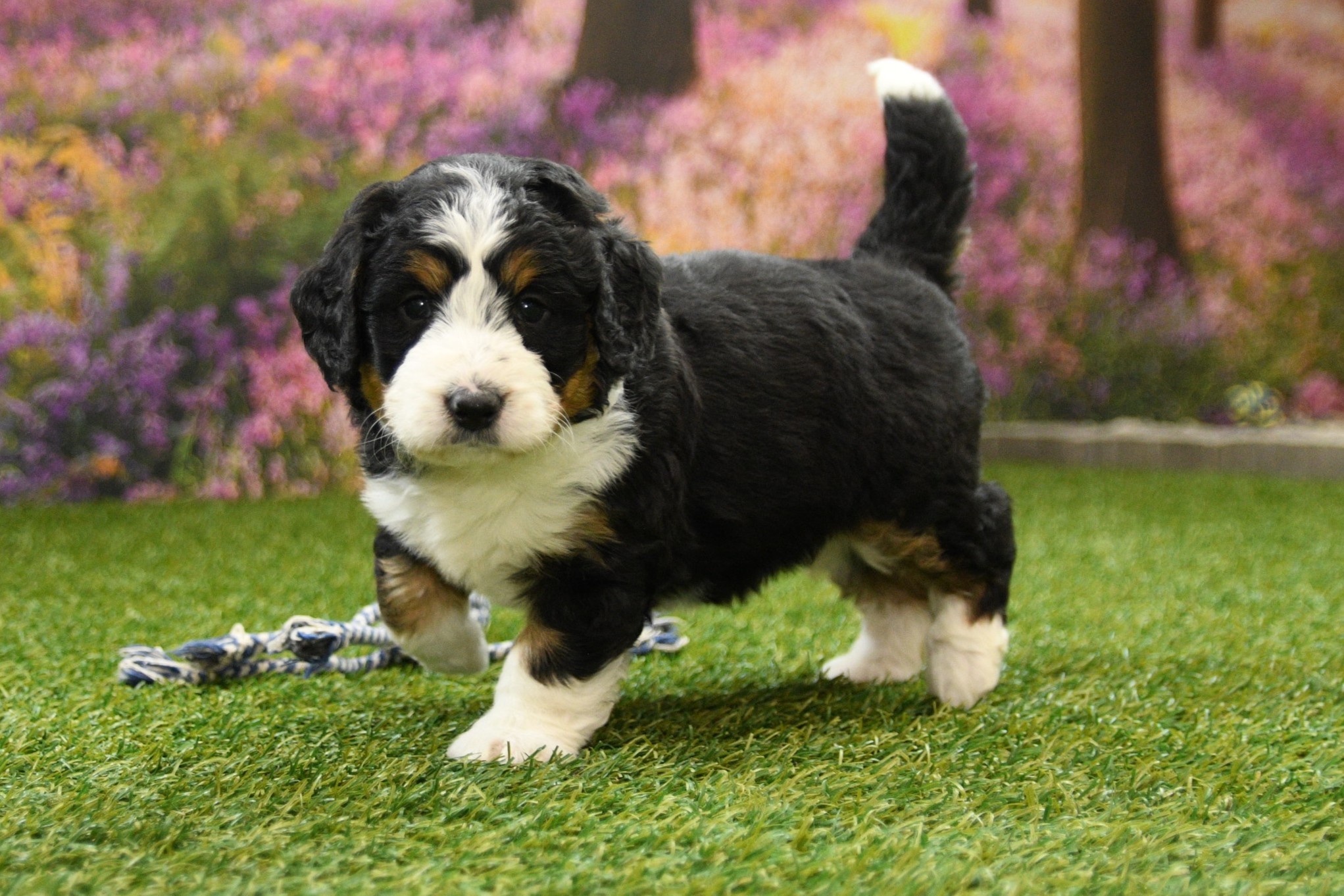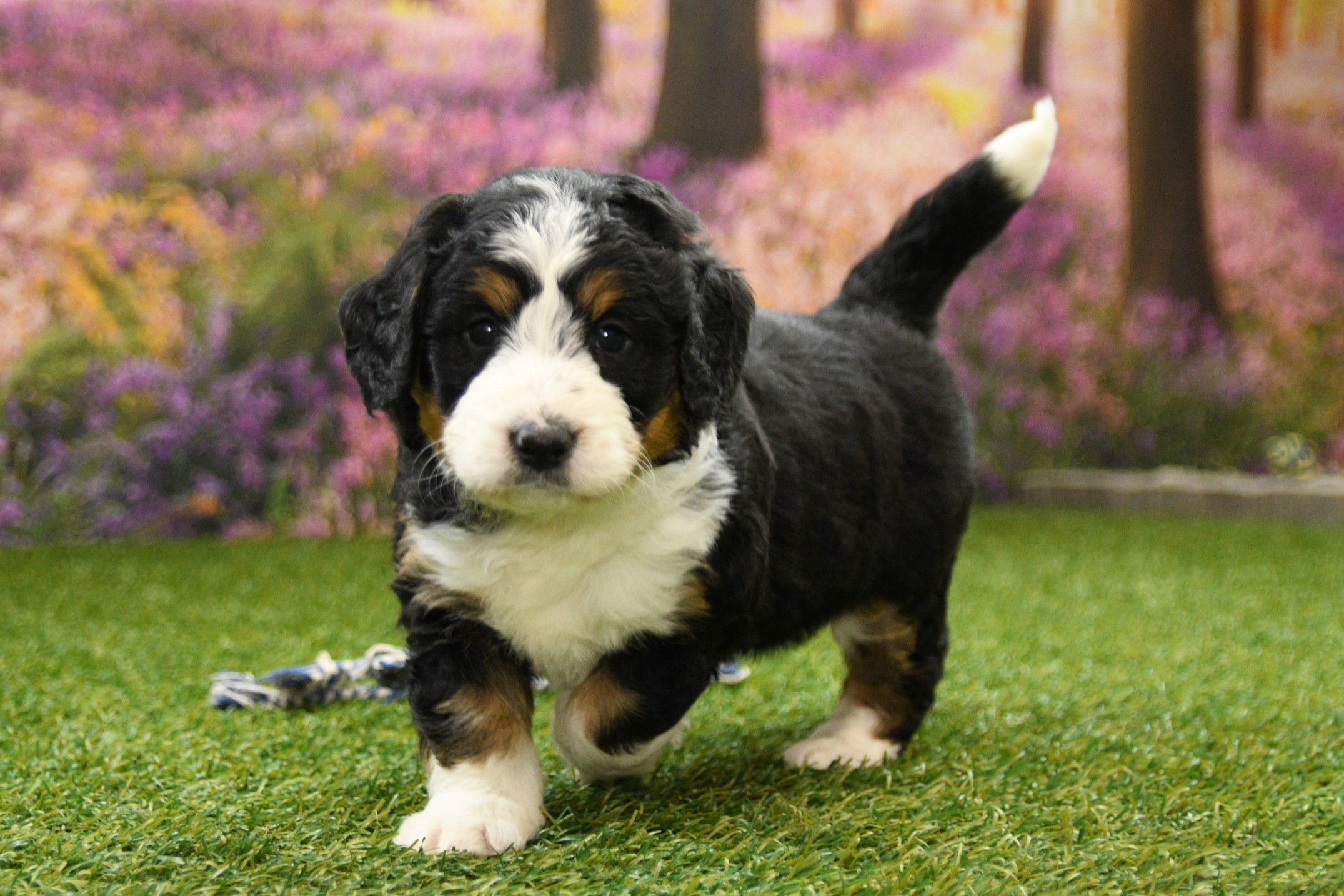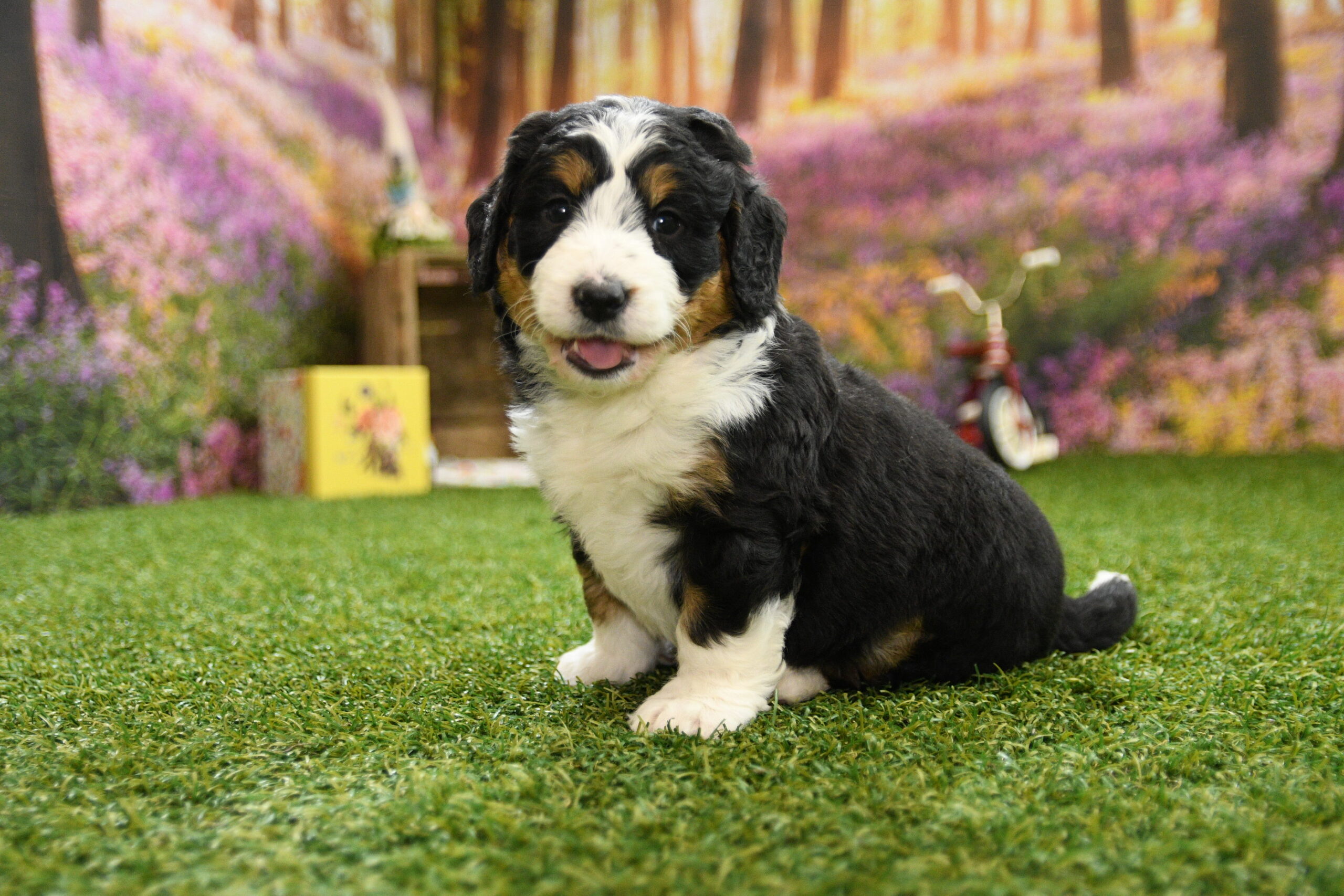 Bella is an F1 mini Bernedoodle that I estimate to be between 35 to 45 pounds as an adult. Our proud parents are Tootsie and Jethro. The mom, Tootsie, is an AKC registered Bernese Mountain Dog that weighs 95 pounds. The dad, Jethro, is a mini-Poodle that weighs 15 pounds. He is fully furnished, so your puppy is guaranteed to have a fluffy face, known as the teddy bear look.