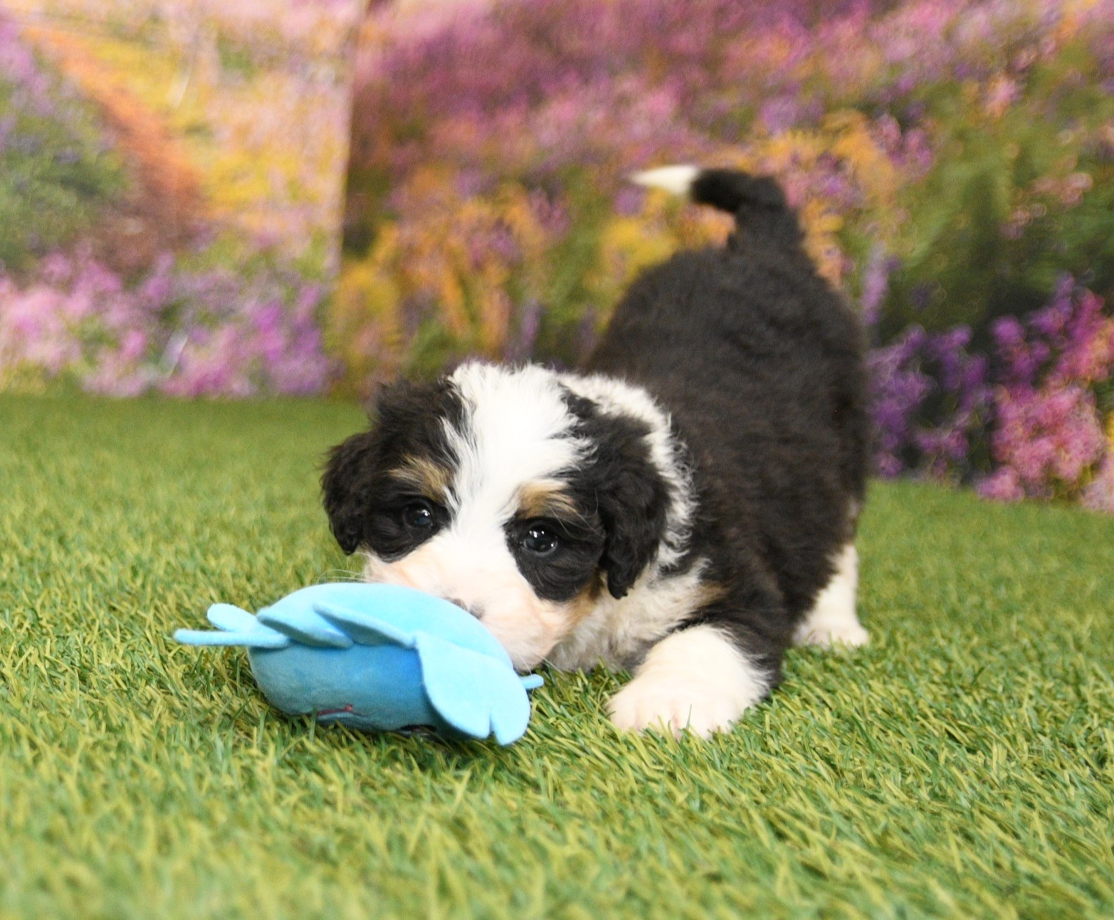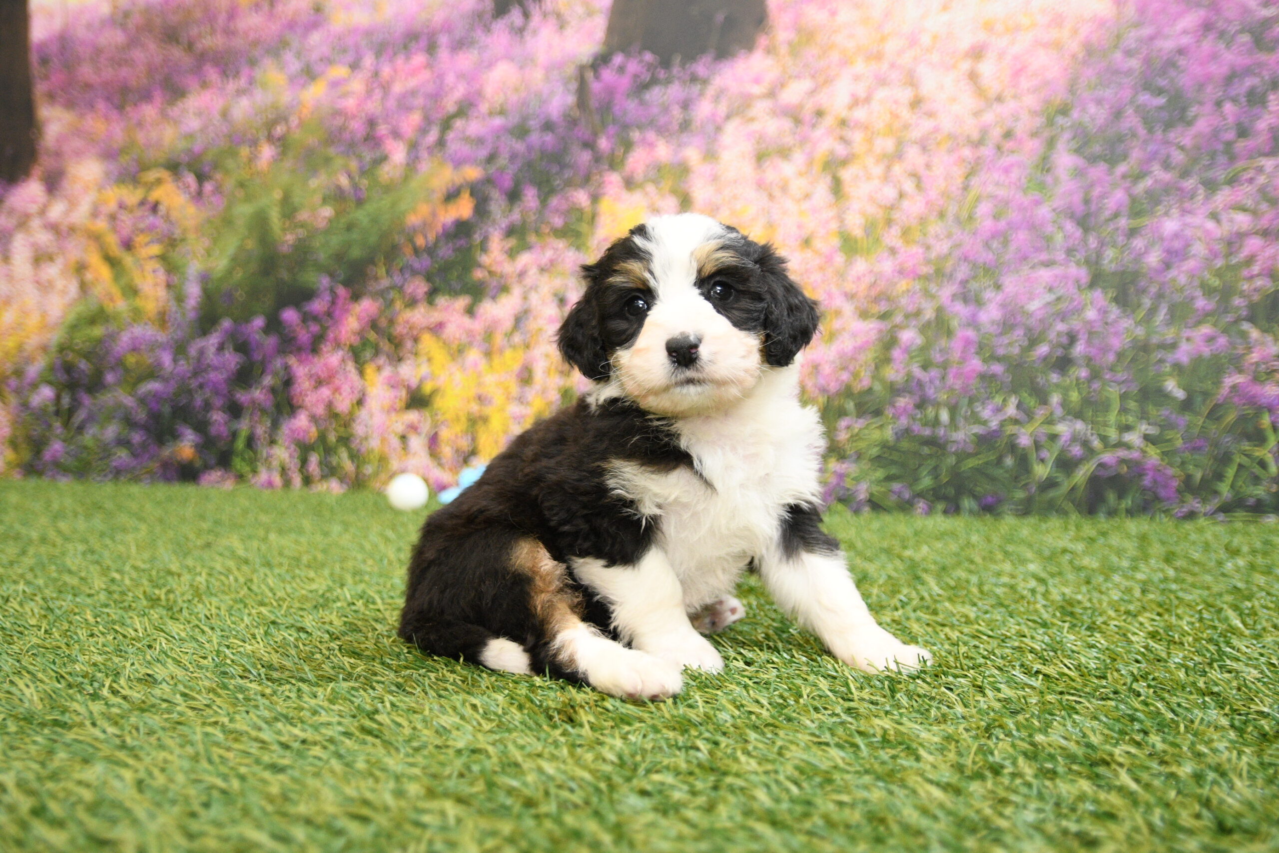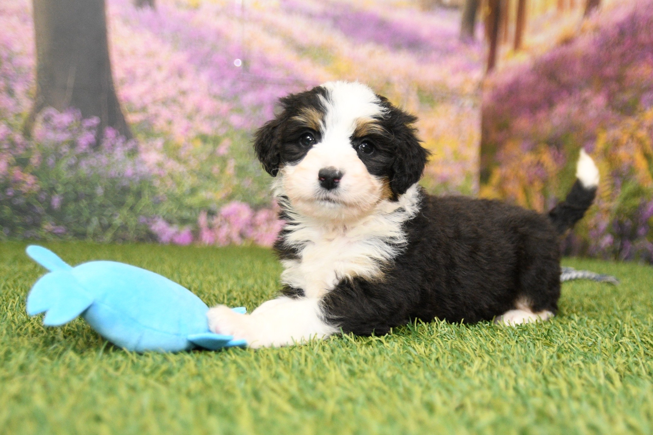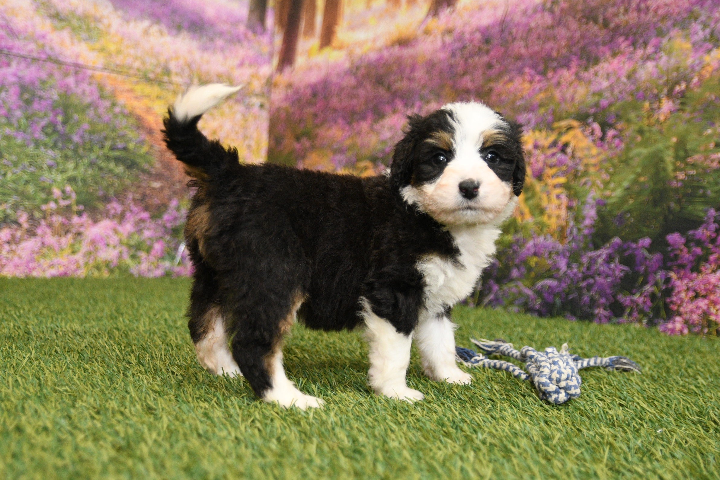 Chloe is an F1 mini Bernedoodle that I estimate to be between 35 to 45 pounds as an adult. Our proud parents are Bonnie and Jethro. The mom, Bonnie, is an AKC registered Bernese Mountain Dog that weighs 95 pounds. The dad, Jethro, is a mini-Poodle that weighs 15 pounds. He is fully furnished, so your puppy is guaranteed to have a fluffy face, known as the teddy bear look.