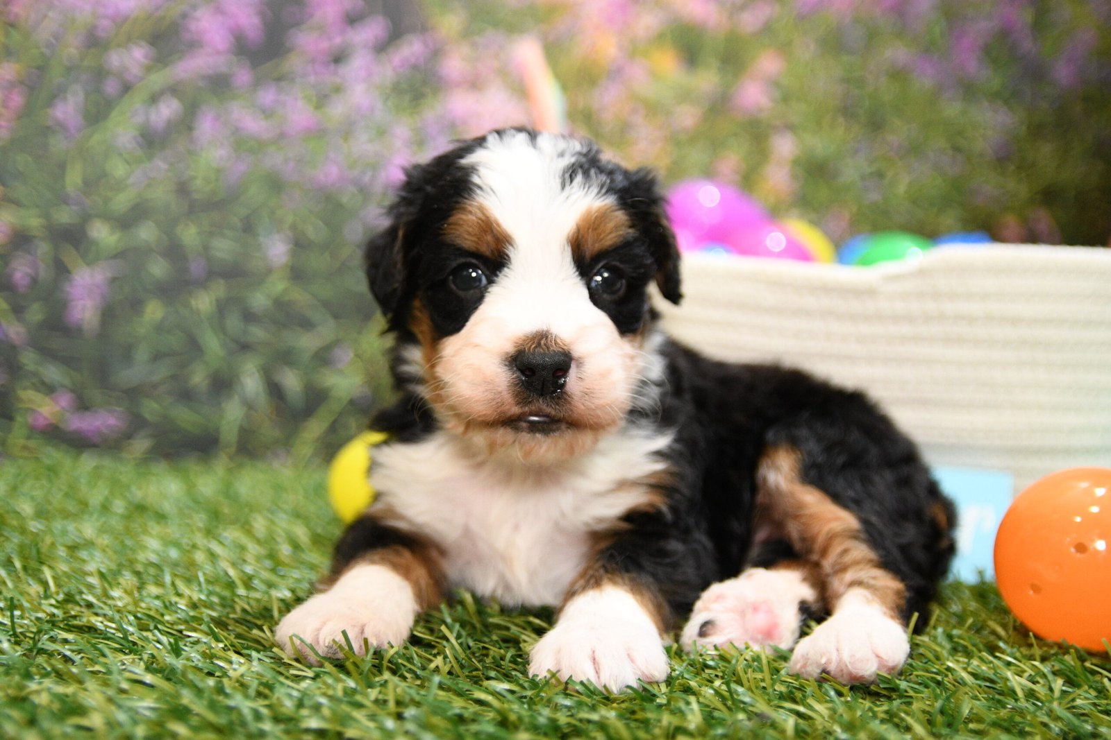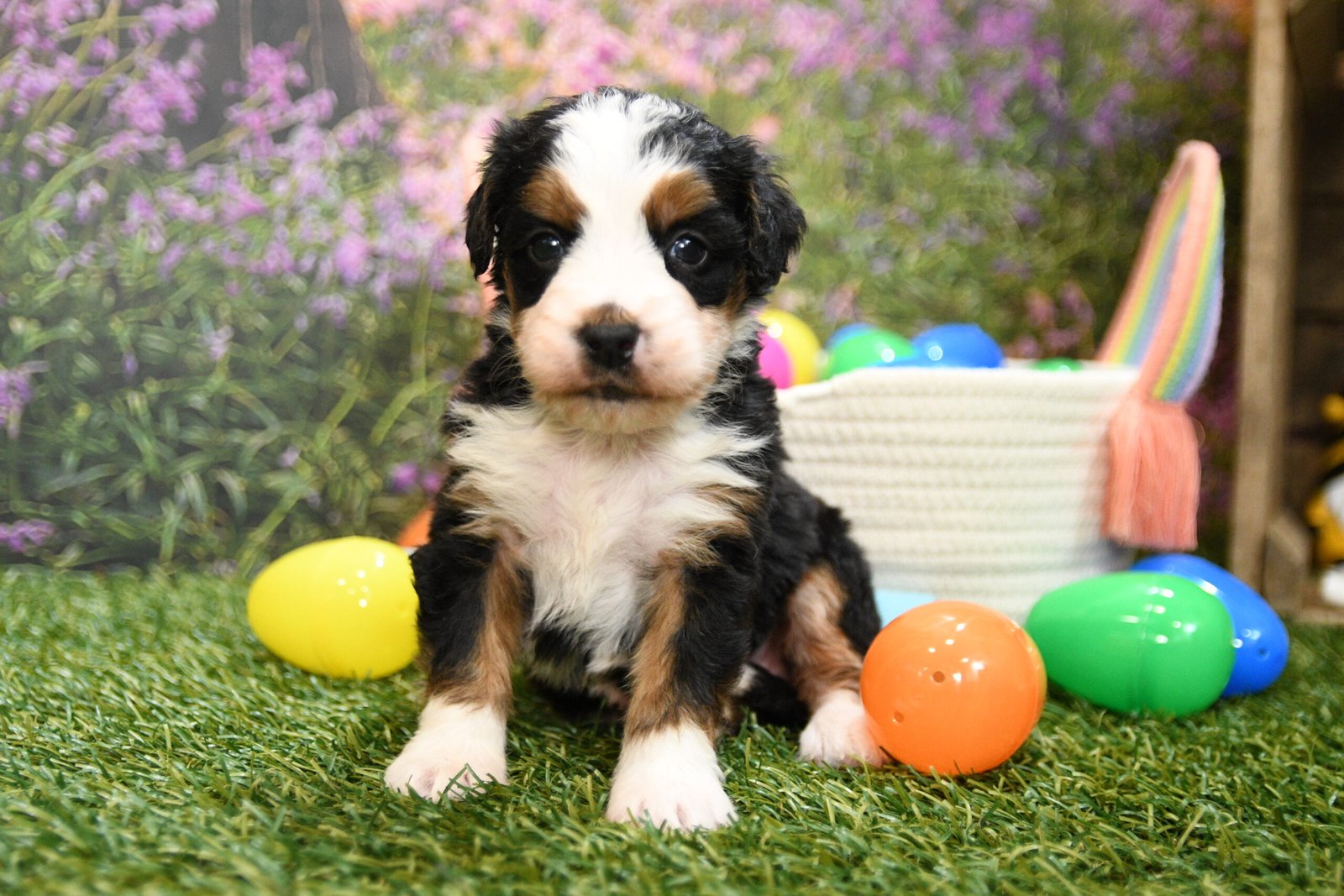 Claire is an F1 mini Bernedoodle that I estimate to be between 35 to 45 pounds as an adult. Our proud parents are Bonnie and Jethro. The mom, Bonnie, is an AKC registered Bernese Mountain Dog that weighs 95 pounds. The dad, Jethro, is a mini-Poodle that weighs 15 pounds. He is fully furnished, so your puppy is guaranteed to have a fluffy face, known as the teddy bear look.