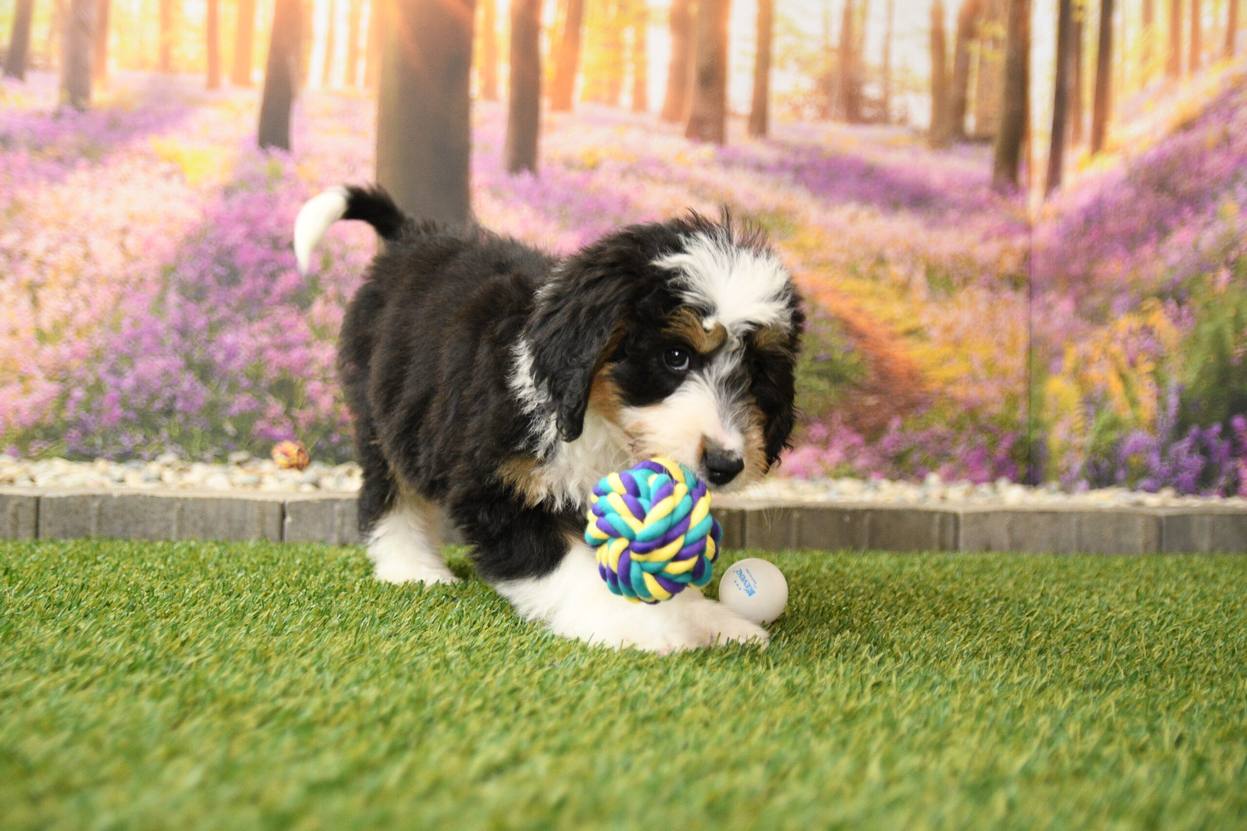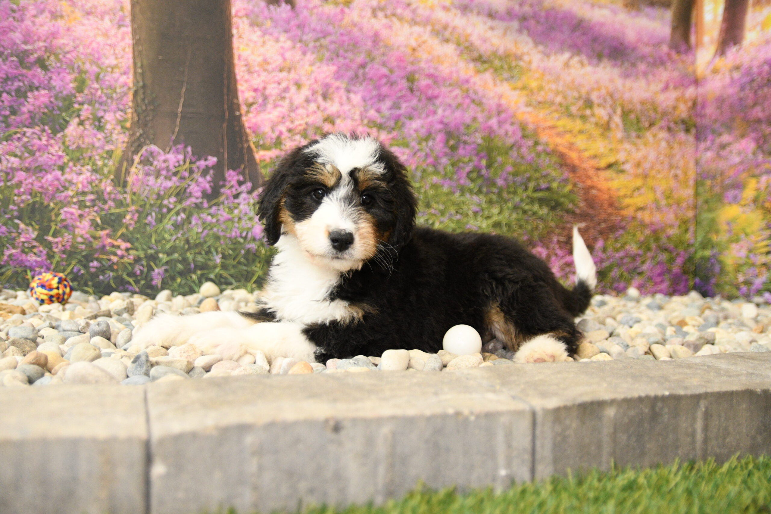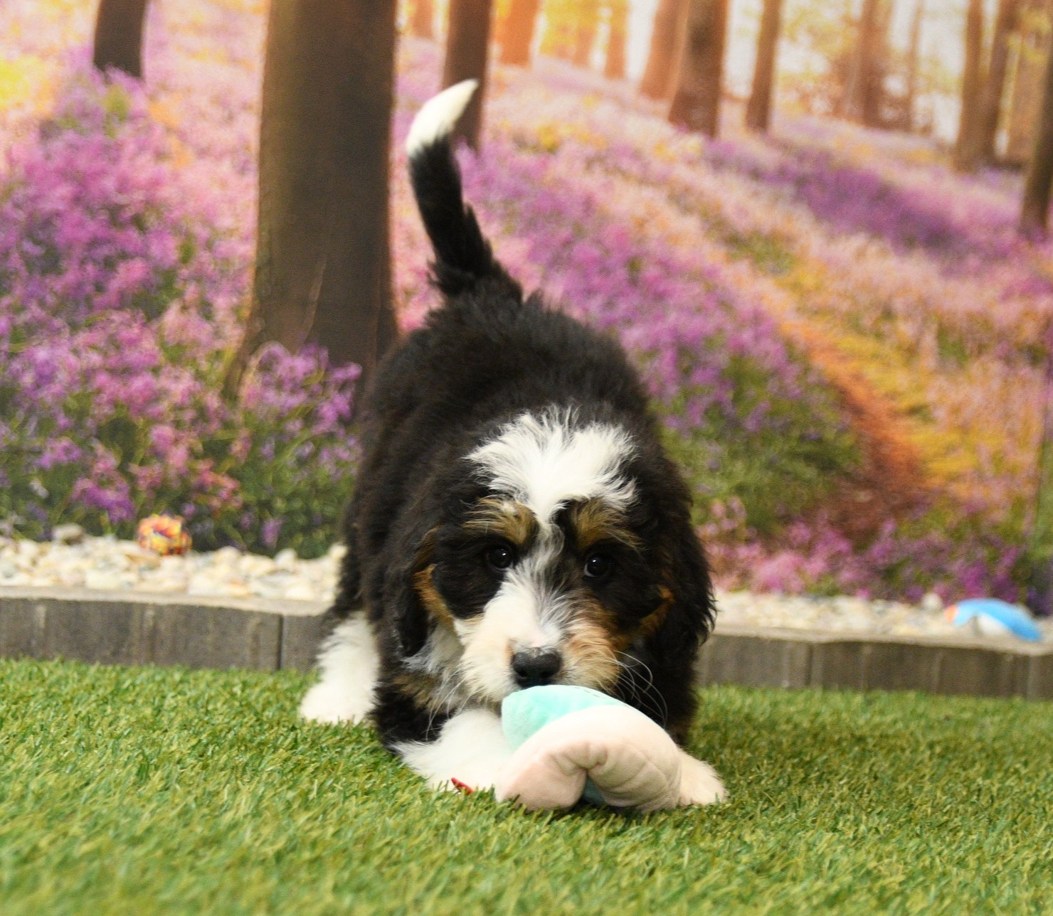 Cora is an F1 mini Bernedoodle that I estimate to be between 35 to 45 pounds as an adult. Our proud parents are Bonnie and Jethro. The mom, Bonnie, is an AKC registered Bernese Mountain Dog that weighs 95 pounds. The dad, Jethro, is a mini-Poodle that weighs 15 pounds. He is fully furnished, so your puppy is guaranteed to have a fluffy face, known as the teddy bear look.