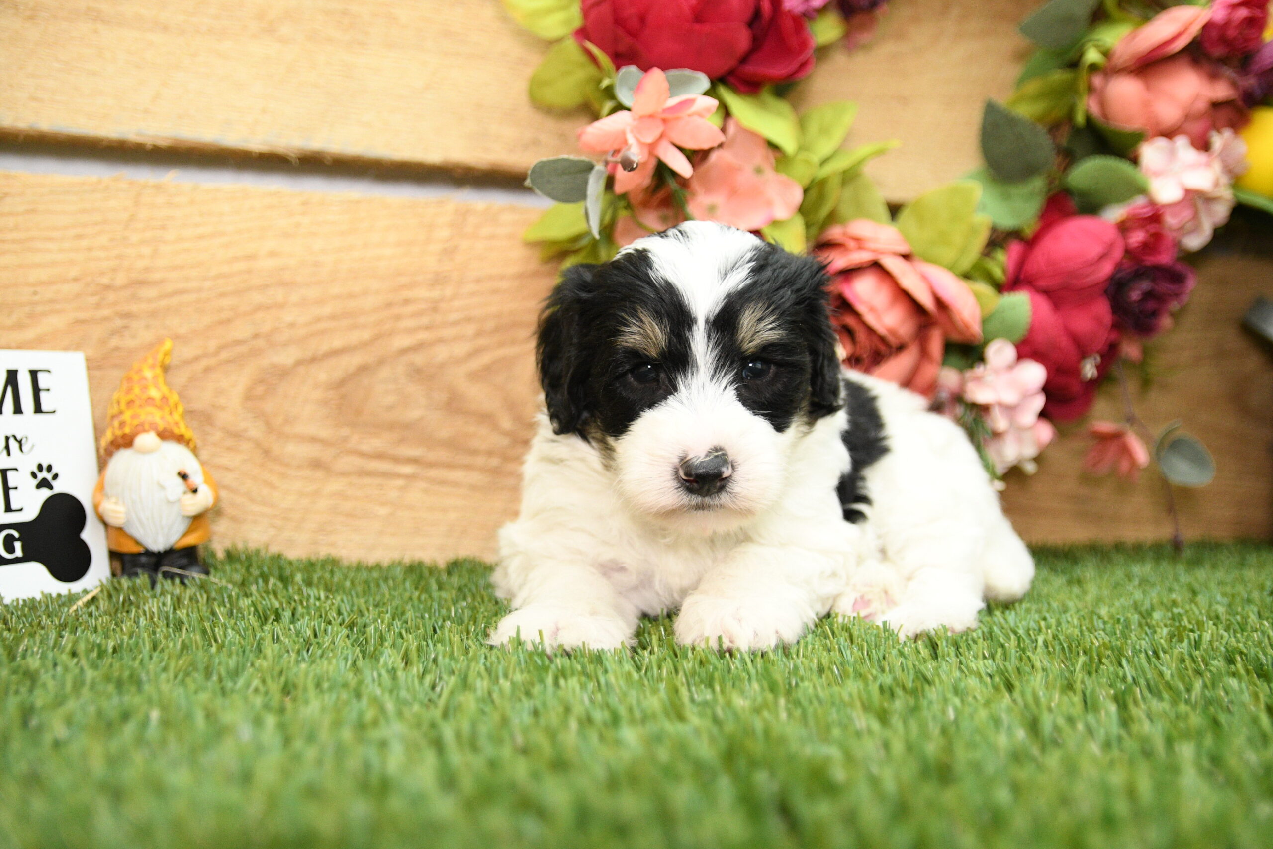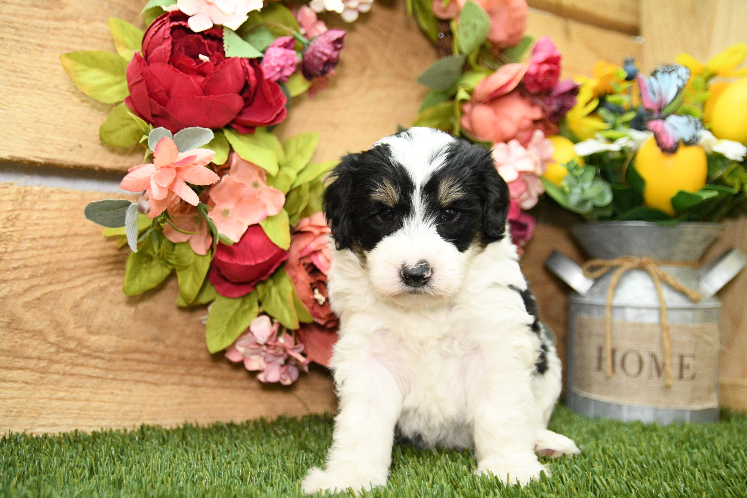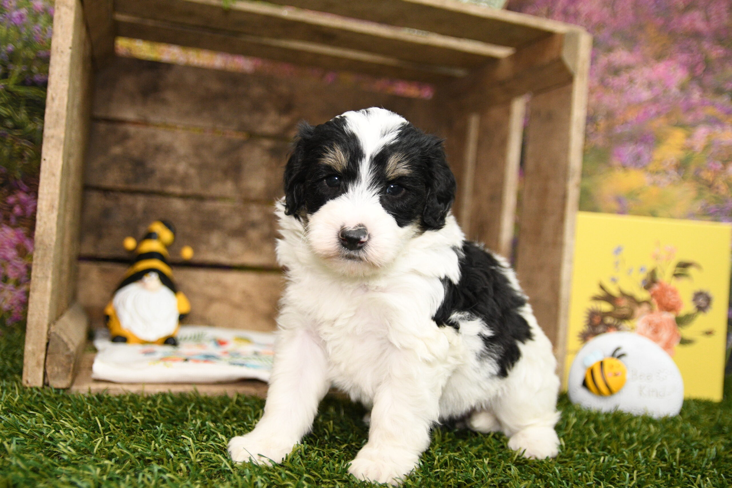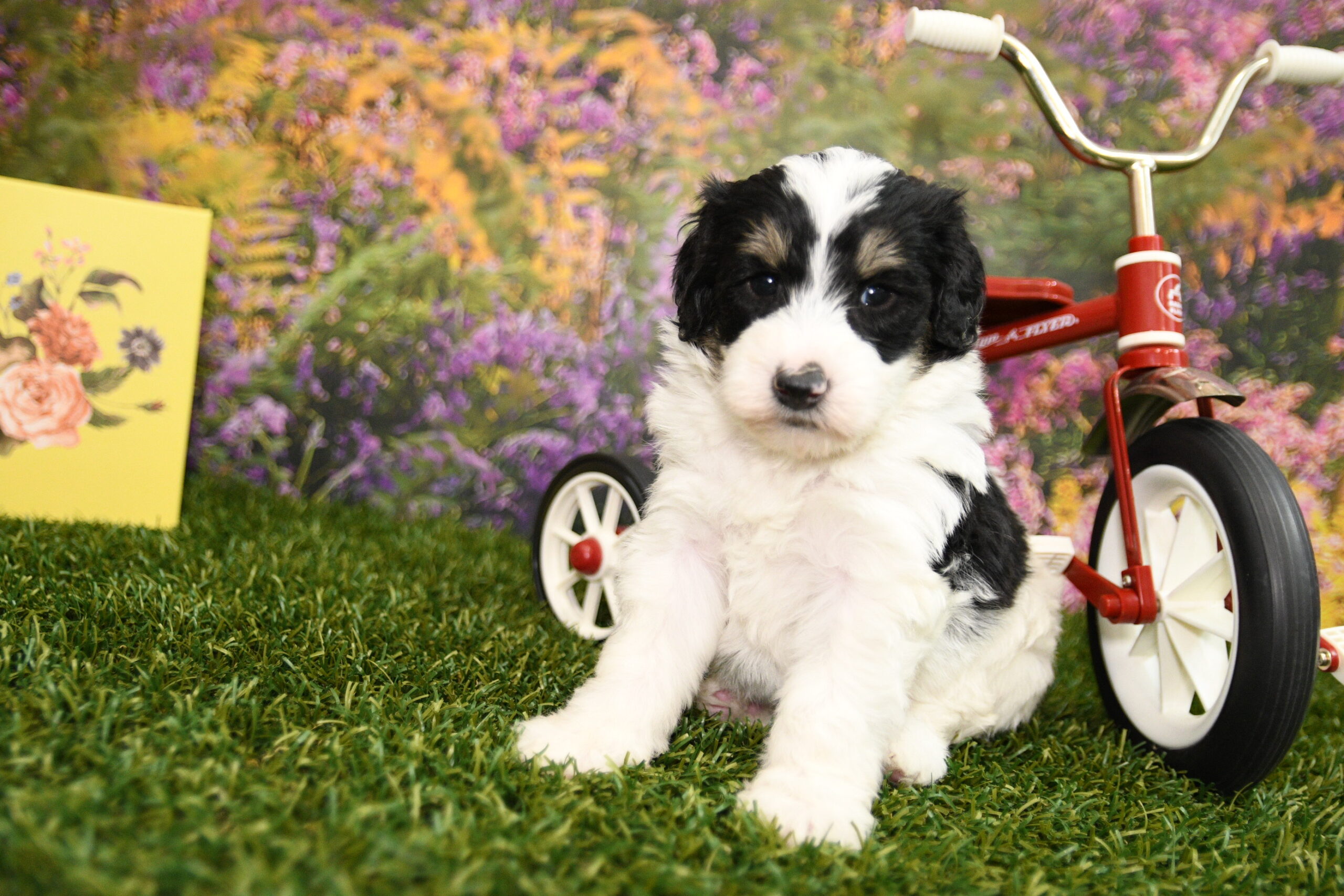 Poppy is an F1B mini Bernedoodle that I estimate to be between 18 to 25 pounds as an adult. Our proud parents are Sugar and Jethro. The mom, Sugar, is a Miniature Bernedoodle that weighs 28 pounds. The dad, Jethro, is a mini-Poodle that weighs 15 pounds. He is fully furnished, so your puppy is guaranteed to have a fluffy face, known as the teddy bear look.